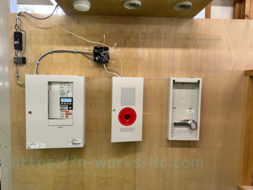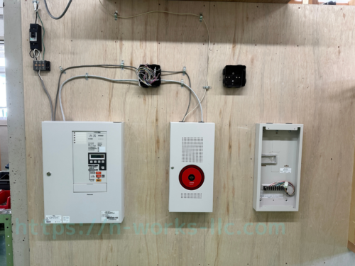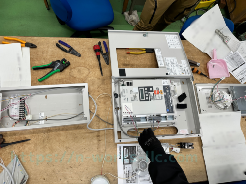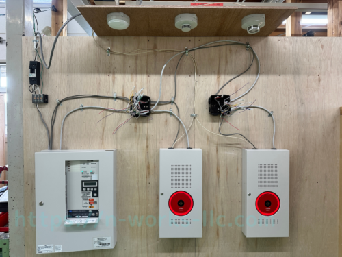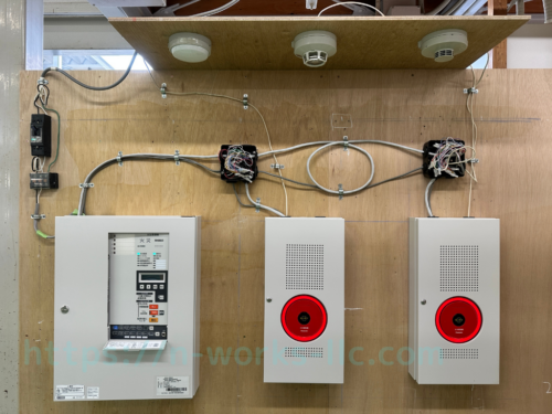 ここまではいわゆる座学で学びますが、最後の施工は実際に自動火災報知設備の機器を配線で繋ぎ合わせて作動させてみるという訓練なので、施工専用の教室を使って行います。