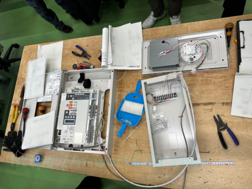 いきなり機器を設置したり配線を接続するのは難しいので、まずは配線の準備(被覆の剥き方や接続の方法)から学んでいき、その後に机の上で配線を接続する訓練を行いました。